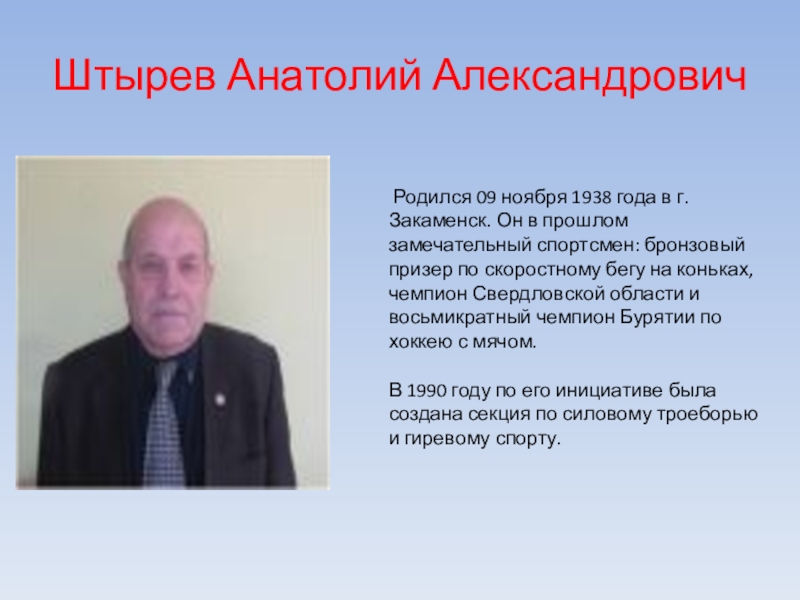 Он в прошлом замечательный спортсмен: бронзовый призер по скоростному бегу на коньках, чемпион Свердловской области и восьмикратный чемпион Бурятии по хоккею с мячом.