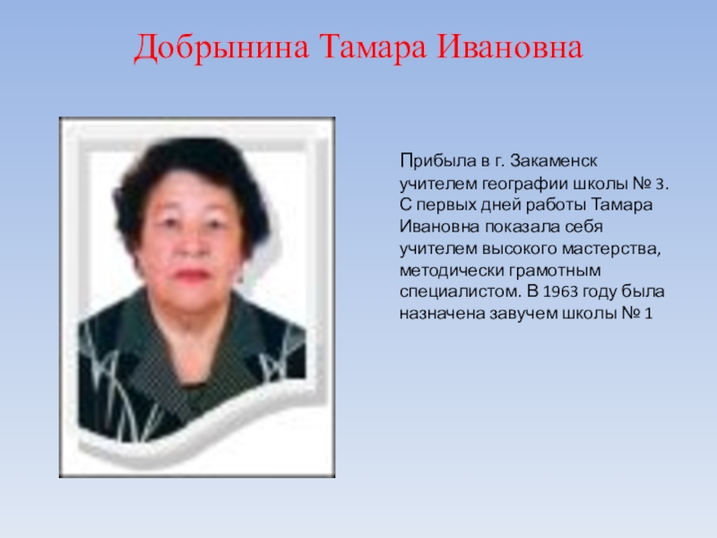 С первых дней работы Тамара Ивановна показала себя учителем высокого мастерства, методически грамотным специалистом. В 1963 году была назначена завучем школы № 1
