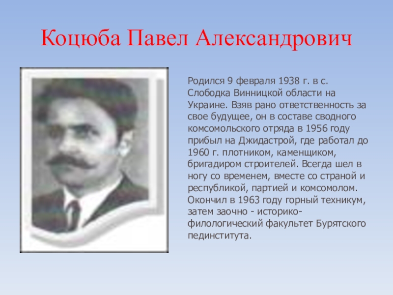 области на Украине. Взяв рано ответственность за свое будущее, он в составе сводного комсомольского отряда в 1956 году прибыл на Джидастрой, где работал до 1960 г. плотником, каменщиком, бригадиром строителей. Всегда шел в ногу со временем, вместе со страной и республикой, партией и комсомолом. Окончил в 1963 году горный техникум, затем заочно - историко-филологический факультет Бурятского пединститута.
