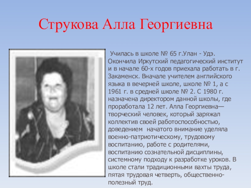 Иркутский педагогический институт и в начале 60-х годов приехала работать в г. Закаменск. Вначале учителем английского языка в вечерней школе, школе № 1, а с 1961 г. в средней школе № 2. С 1980 г. назначена директором данной школы, где проработала 12 лет. Алла Георгиевна—творческий человек, который заряжал коллектив своей работоспособностью, доведением начатого внимание уделяла военно-патриотическому, трудовому воспитанию, работе с родителями, воспитанию сознательной дисциплины, системному подходу к разработке уроков. В школе стали традиционными вахты труда, пятая трудовая четверть, общественно-полезный труд.