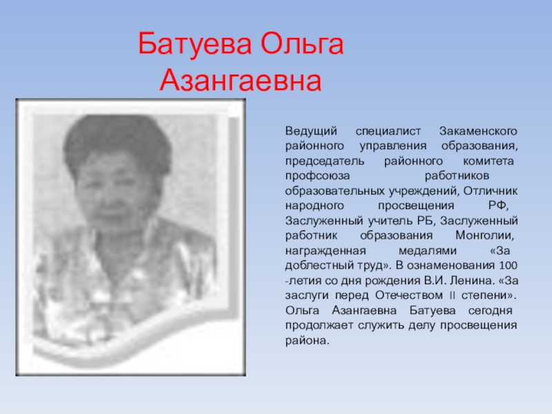 образовательных учреждений, Отличник народного просвещения РФ, Заслуженный учитель РБ, Заслуженный работник образования Монголии, награжденная медалями «За доблестный труд». В ознаменования 100 -летия со дня рождения В.И. Ленина. «За заслуги перед Отечеством II степени». Ольга Азангаевна Батуева сегодня продолжает служить делу просвещения района.