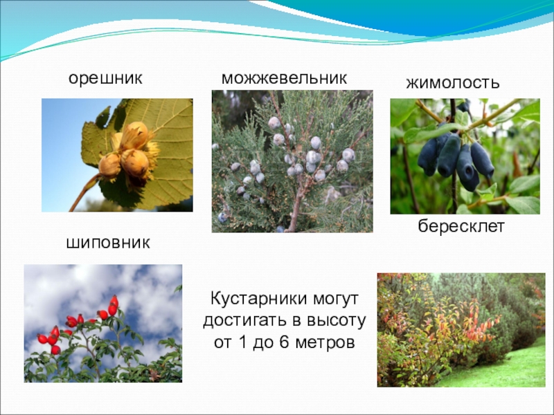 орешникможжевельникжимолостьшиповникбересклетКустарники могут достигать в высоту от 1 до 6 метров