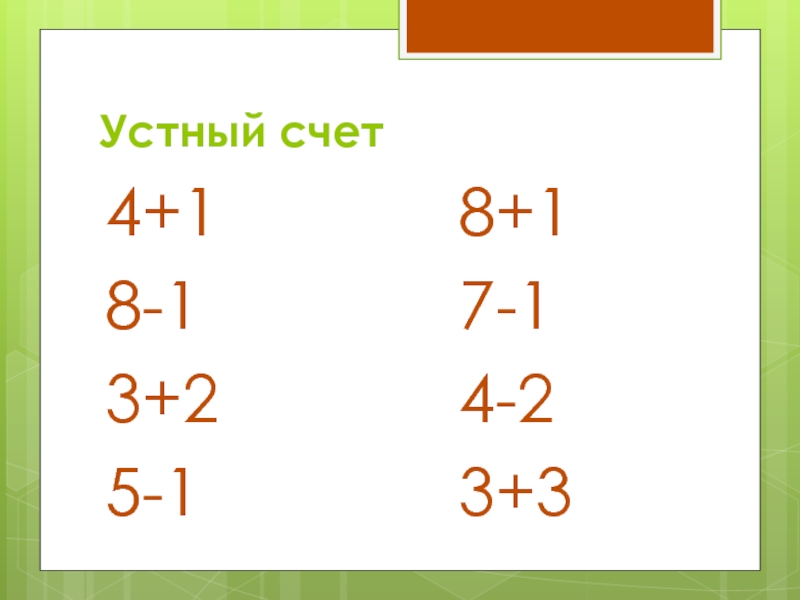 Устный счет 4+1 8+18-1 7-13+2 4-25-1 3+3