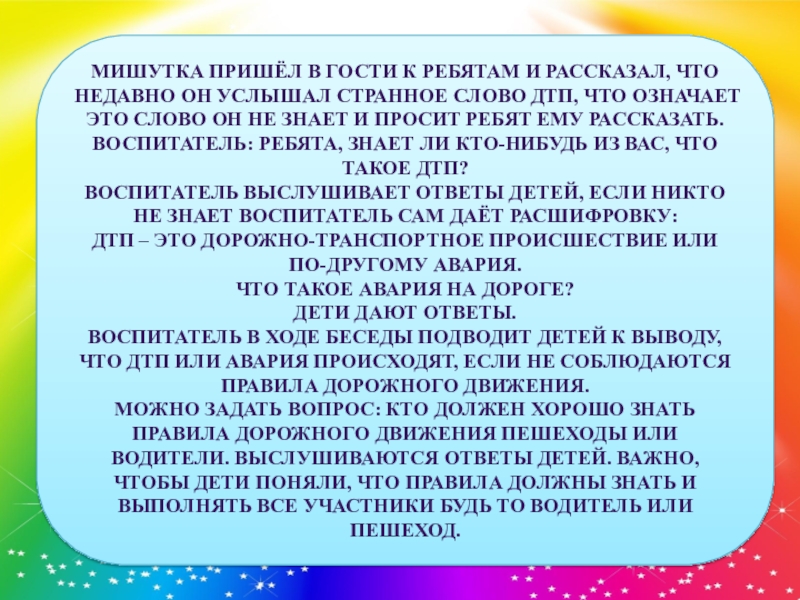 услышал странное слово ДТП, что означает это слово он не знает и просит ребят ему рассказать.