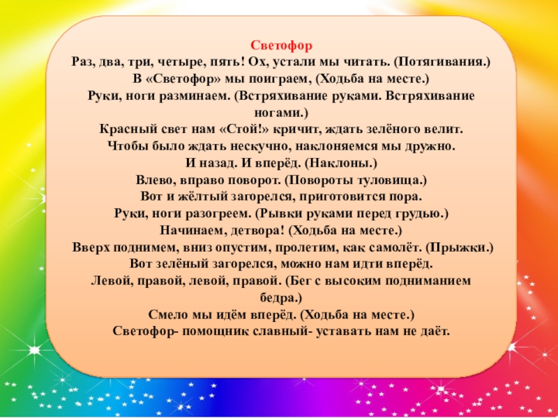 Раз, два, три, четыре, пять! Ох, устали мы читать. (Потягивания.)