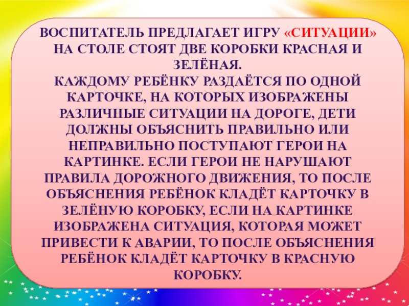 ребёнку раздаётся по одной карточке, на которых изображены различные ситуации на дороге, дети должны объяснить правильно или неправильно поступают герои на картинке. Если герои не нарушают правила дорожного движения, то после объяснения ребёнок кладёт карточку в зелёную коробку, если на картинке изображена ситуация, которая может привести к аварии, то после объяснения ребёнок кладёт карточку в красную коробку.