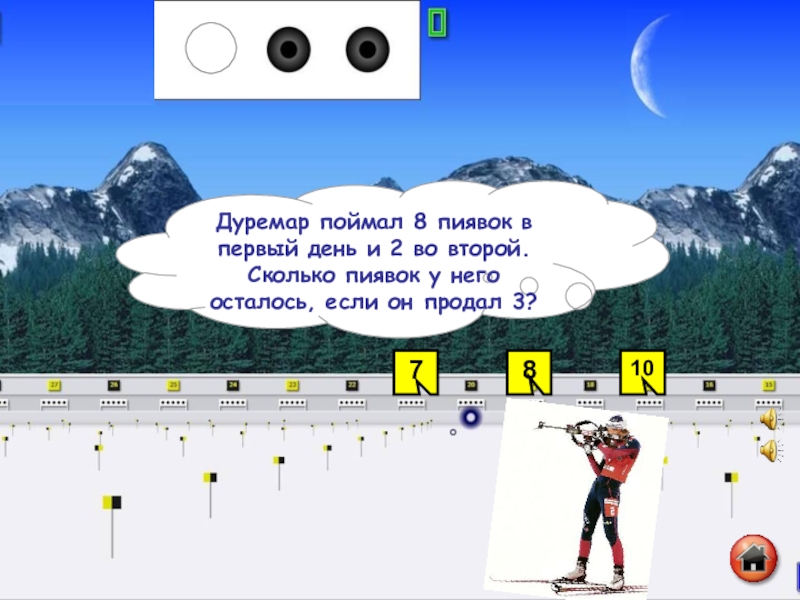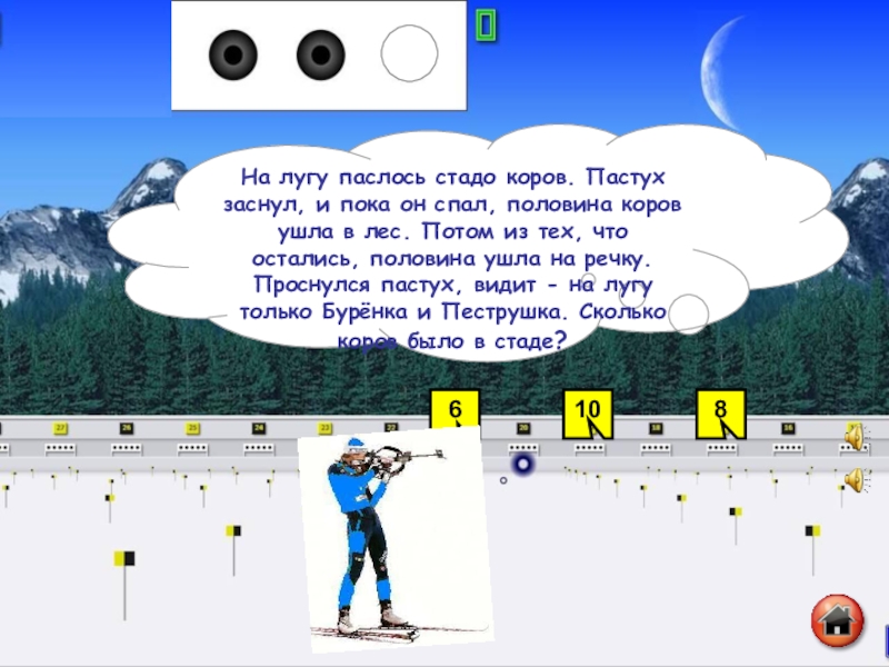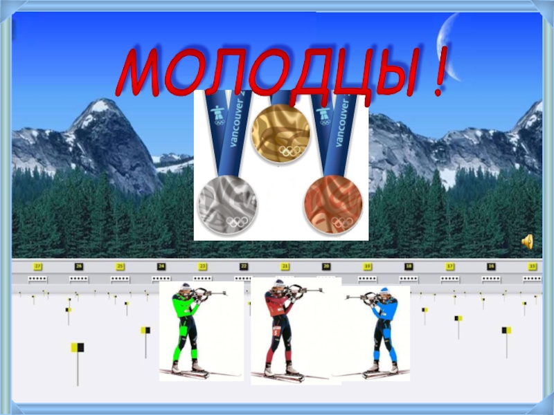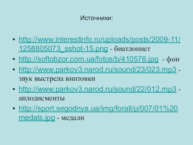 Источники:http://www.interestinfo.ru/uploads/posts/2009-11/1258805073_sshot-15.png - биатлонистhttp://softobzor.com.ua/fotos/b/410576.jpg - фонhttp://www.parkov3.narod.ru/sound/23/023.mp3 - звук выстрела винтовкиhttp://www.parkov3.narod.ru/sound/22/012.mp3 - аплодисментыhttp://sport.segodnya.ua/img/forall/p/007/01%20medals.jpg - медали