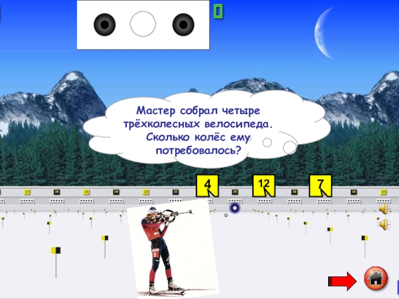 4127Мастер собрал четыре трёхколесных велосипеда. Сколько колёс ему потребовалось?