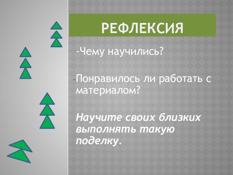 -Чему научились?Понравилось ли работать с материалом?Научите своих близких выполнять такую поделку.Рефлексия