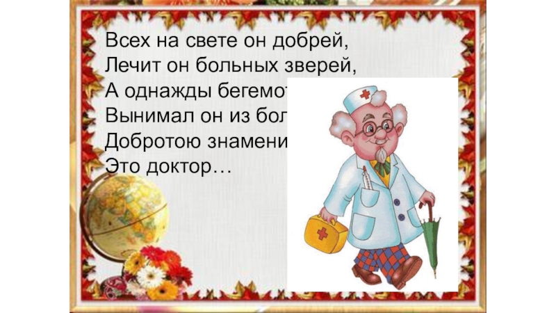 Слайд 6Всех на свете он добрей, Лечит он больных зверей, А однажды бегемота Вынимал