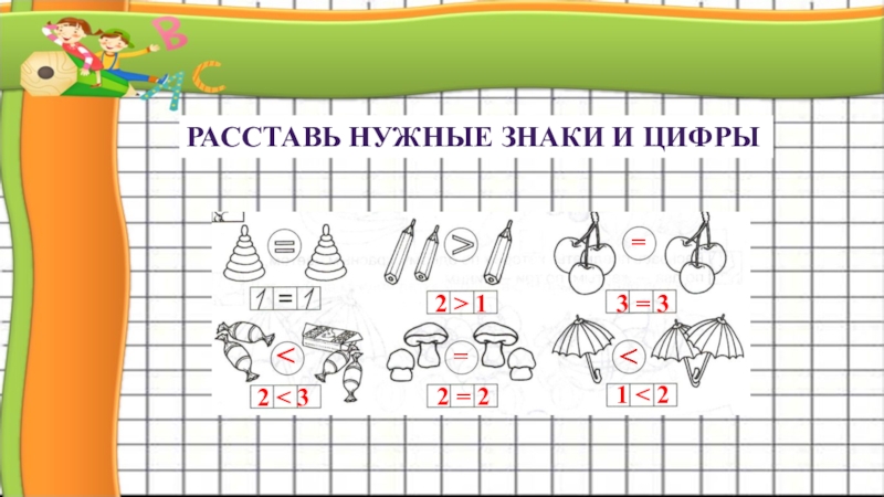 Слайд 23РАССТАВЬ НУЖНЫЕ ЗНАКИ И ЦИФРЫ