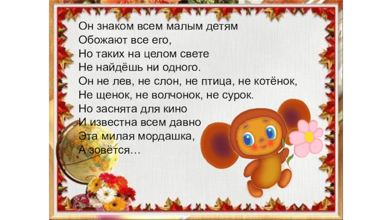 найдёшь ни одного. Он не лев, не слон, не птица, не котёнок, Не щенок, не волчонок, не сурок. Но заснята для кино И известна всем давно Эта милая мордашка, А зовётся…