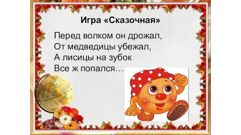 Игра «Сказочная»Перед волком он дрожал, От медведицы убежал, А лисицы на зубок Все ж попался…
