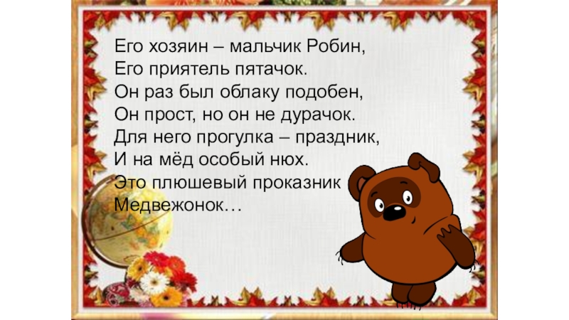прост, но он не дурачок. Для него прогулка – праздник, И на мёд особый нюх. Это плюшевый проказник Медвежонок…