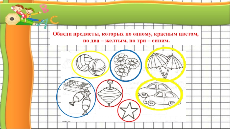 Слайд 18Обведи предметы, которых по одному, красным цветом,