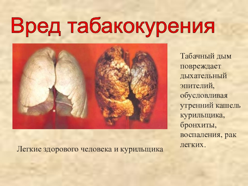 обусловливая утренний кашель курильщика, бронхиты, воспаления, рак легких.