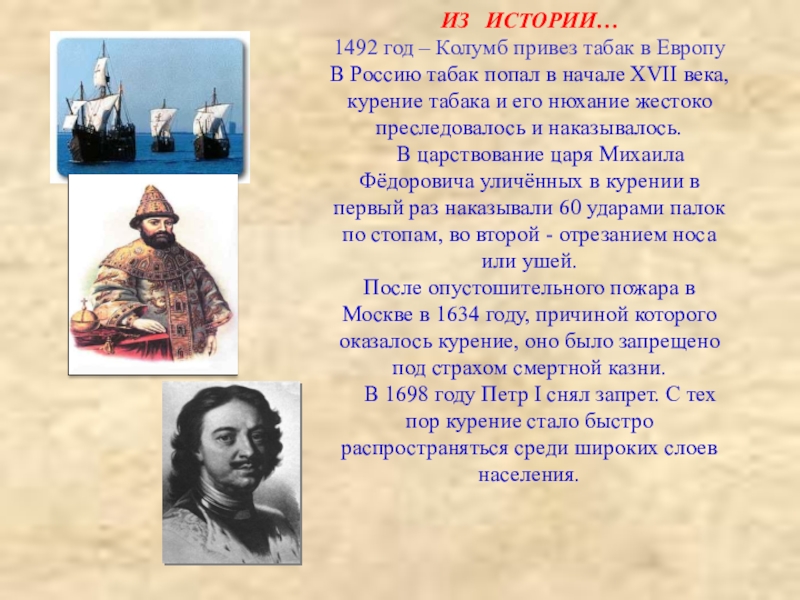 После опустошительного пожара в Москве в 1634 году, причиной которого оказалось курение, оно было запрещено под страхом смертной казни.