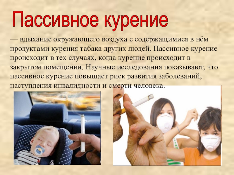 курения табака других людей. Пассивное курение происходит в тех случаях, когда курение происходит в закрытом помещении. Научные исследования показывают, что пассивное курение повышает риск развития заболеваний, наступления инвалидности и смерти человека.
