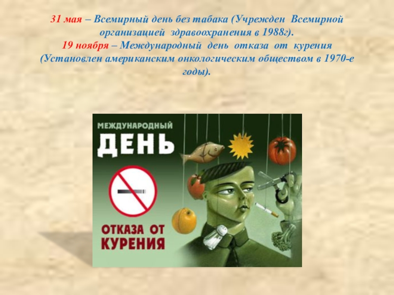 19 ноября – Международный день отказа от курения (Установлен американским онкологическим обществом в 1970-е годы).