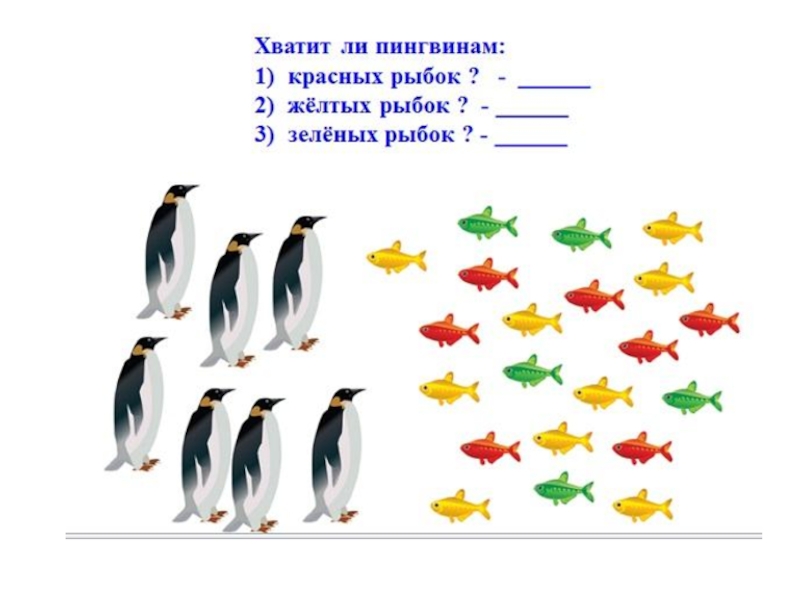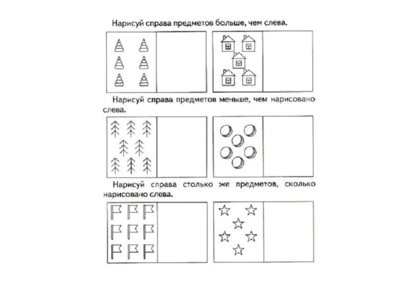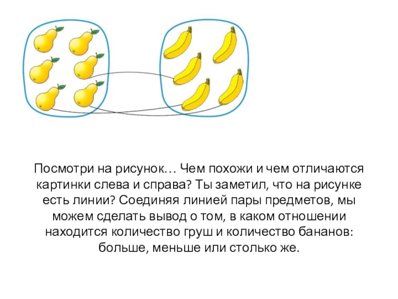 справа? Ты заметил, что на рисунке есть линии? Соединяя линией пары предметов, мы можем сделать вывод о том, в каком отношении находится количество груш и количество бананов: больше, меньше или столько же.