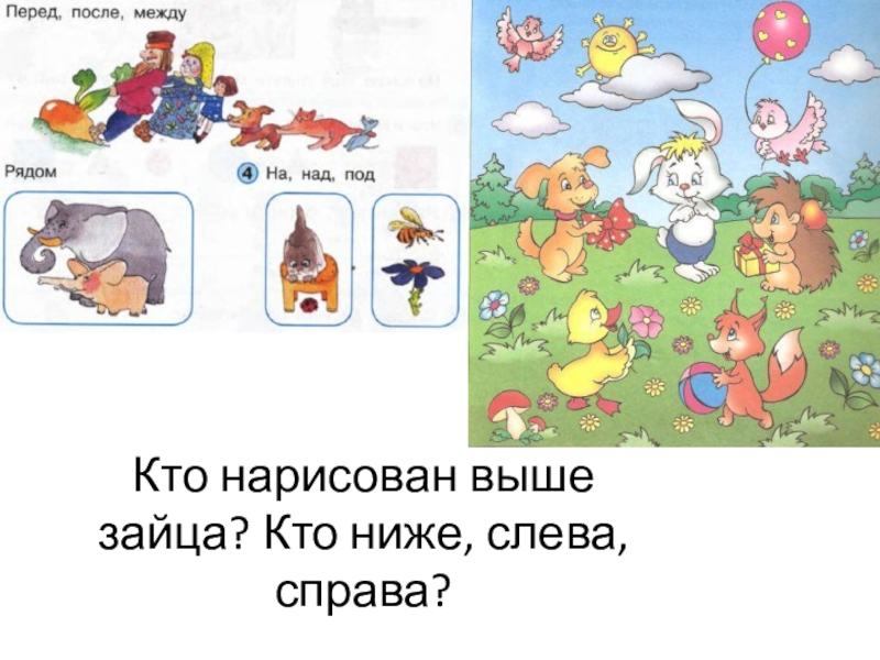 Слайд 19Кто нарисован выше зайца? Кто ниже, слева, справа?