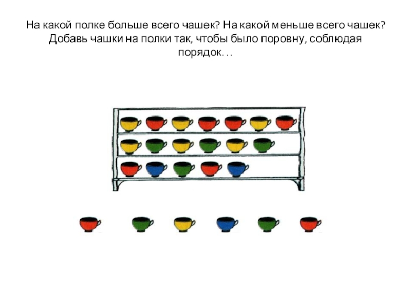 Добавь чашки на полки так, чтобы было поровну, соблюдая порядок…
