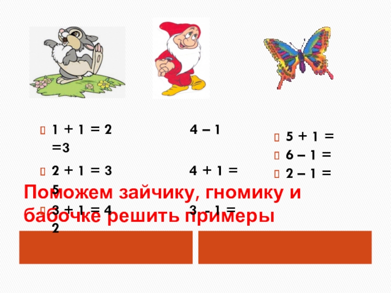 Поможем зайчику, гномику и бабочке решить примеры1 + 1 = 2 4 – 1 =3 2 + 1 = 3