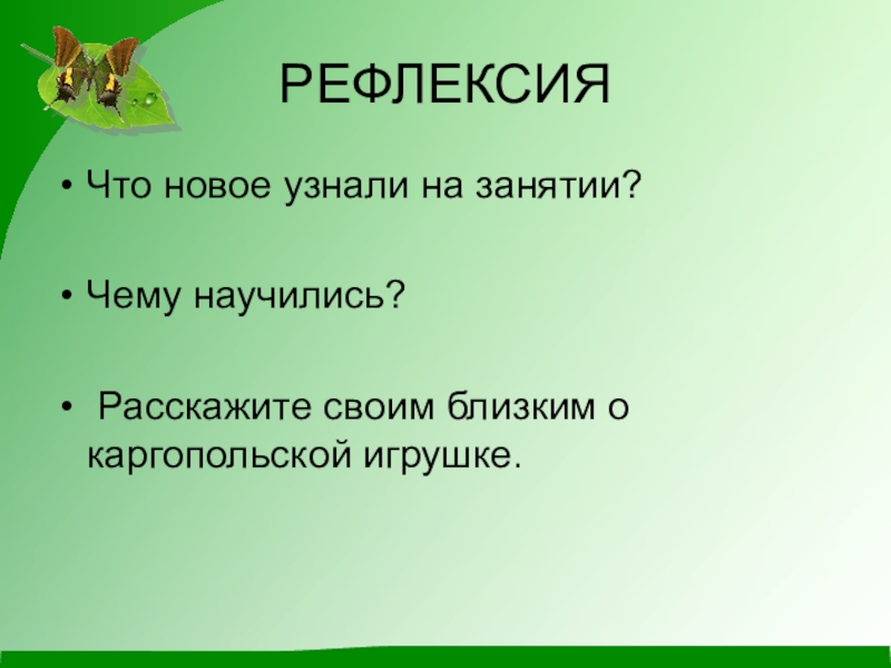 РЕФЛЕКСИЯЧто новое узнали на занятии?Чему научились? Расскажите своим близким о каргопольской игрушке.
