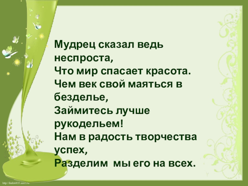 Мудрец сказал ведь неспроста, Что мир спасает красота. Чем век свой маяться в безделье, Займитесь лучше рукодельем!Нам