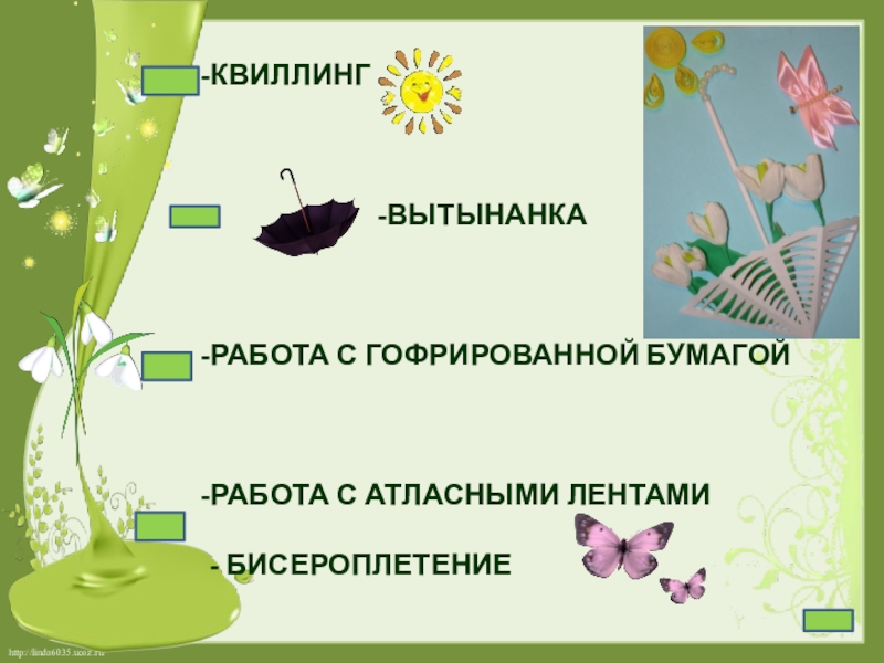 КВИЛЛИНГВЫТЫНАНКАРАБОТА С ГОФРИРОВАННОЙ БУМАГОЙРАБОТА С АТЛАСНЫМИ ЛЕНТАМИ- БИСЕРОПЛЕТЕНИЕ