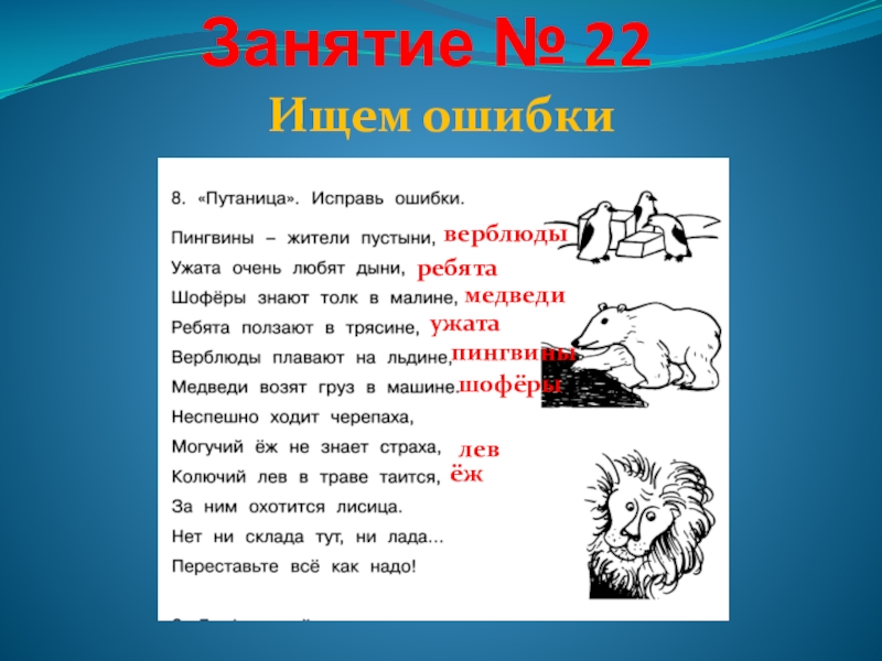 Занятие № 22верблюдыребятамедведиужатапингвинышофёрылевёжИщем ошибки