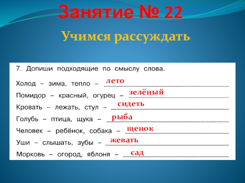 Занятие № 22летозелёныйсидетьрыбащенокжеватьсадУчимся рассуждать