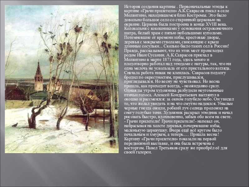 писал в селе Молвитино, находившемся близ Костромы. Это было довольно большое село со старинной церковью на окраине. Церковь была построена в конце XVIII века. Колокольня с кокошниками у основания остроконечного шатра, белый храм с пятью небольшими куполами. Потемневшие от времени избы, крестовые дворы, деревья с мокрыми стволами, свисающие с крыш длинные сосульки... Сколько было таких сел в России! Правда, рассказывают, что из этих мест происходил родом Иван Сусанин. А.К.Саврасов приехал в Молвитино в марте 1871 года, здесь много и плодотворно работал над этюдами с натуры, так, что ни одна мелочь не ускользала от его пристального взгляда. Сначала работа никак не клеилась. Саврасов подолгу бродил по окрестностям, прислушивался, приглядывался. Но весну не чувствовал. Но весна пришла, как приходит всегда, - неожиданно сразу. Однажды утром художника разбудили неугомонные птичьи голоса. Алексей Кондратьевич выглянул в окошко и рассмеялся: за окном голубело небо. Он увидел то, что желал увидеть и на что смутно надеялся. Унылые черные гнезда ожили, робкий луч солнца проложил на снегу голубые тени. Художник раскрыл этюдник и начал рисовать быстро, вдохновенно, забыв обо всем на свете. - Грачи прилетели! Грачи прилетели!- напевал он, набрасывая на холсте деревья, почерневшие избы, маленькую церквушку. Вчера ещё всё кругом было печальным и хмурым, а теперь.… Пришла весна!Картину «Грачи прилетели» показали на первой передвижной выставке, и она была встречена с восторгом. Павел Третьяков сразу же приобрёл её для своей галереи.