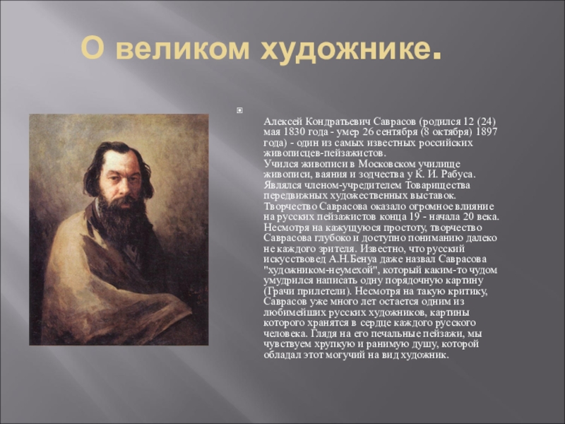 О великом художнике. Алексей Кондратьевич Саврасов (родился 12 (24) мая 1830 года - умер 26 сентября (8 октября) 1897 года) - один из самых известных российских живописцев-пейзажистов. Учился живописи в Московском училище живописи, ваяния и зодчества