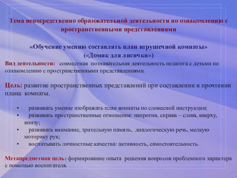 Цель: закреплять умение изображать план комнаты.