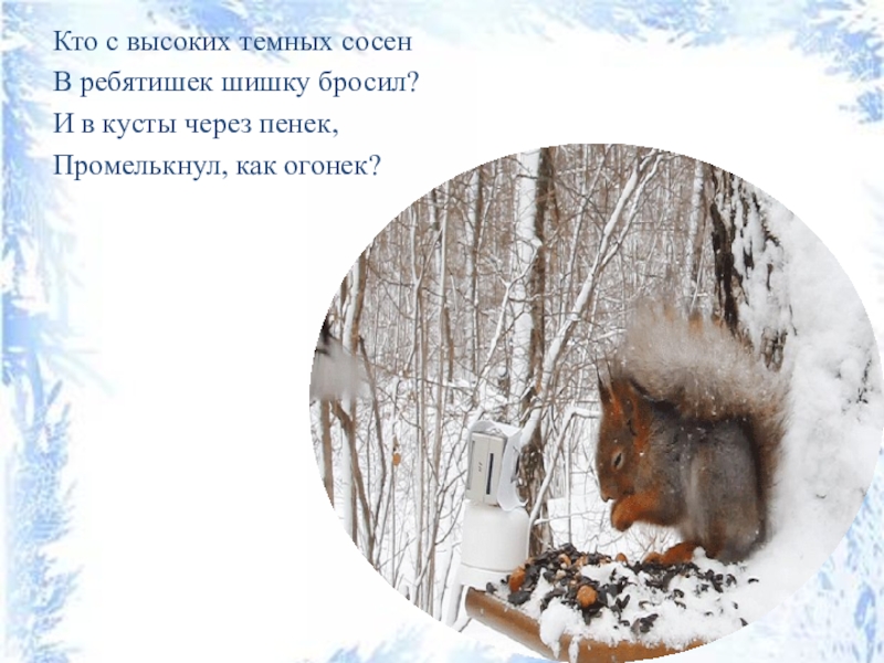Кто с высоких темных сосенВ ребятишек шишку бросил?И в кусты через пенек,Промелькнул, как огонек?