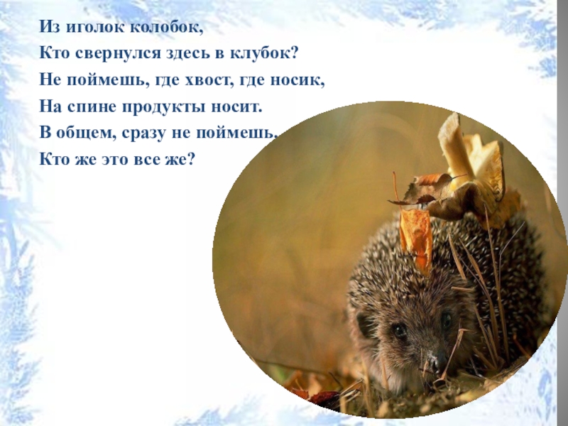 Из иголок колобок, Кто свернулся здесь в клубок? Не поймешь, где хвост, где носик, На спине