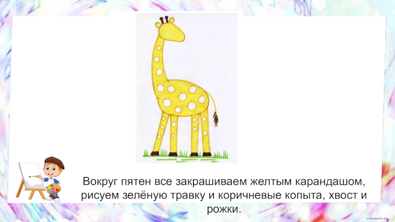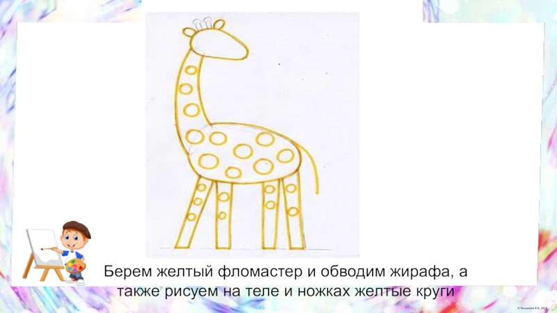 Слайд 26Берем желтый фломастер и обводим жирафа, а также рисуем на теле