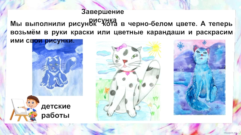 возьмём в руки краски или цветные карандаши и раскрасим ими свои рисунки.