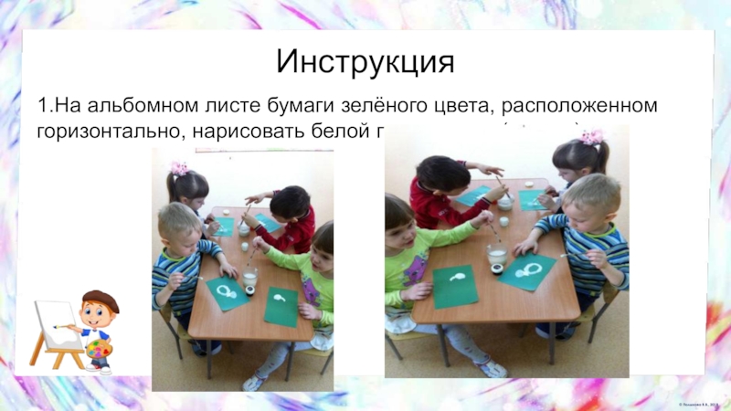 1.На альбомном листе бумаги зелёного цвета, расположенном горизонтально, нарисовать белой гуашью