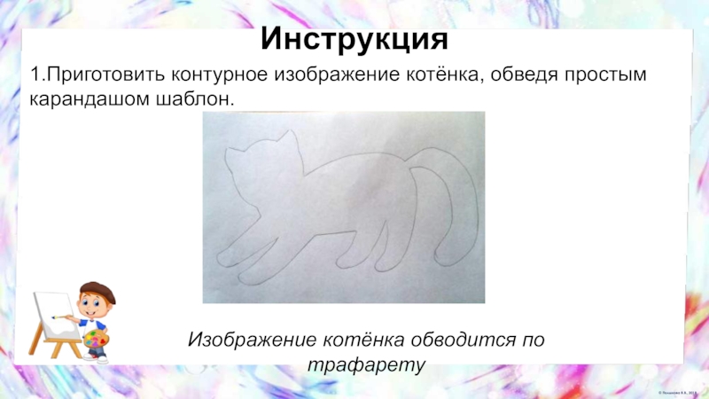 1.Приготовить контурное изображение котёнка, обведя простым карандашом шаблон.