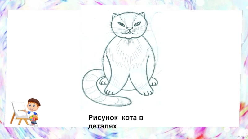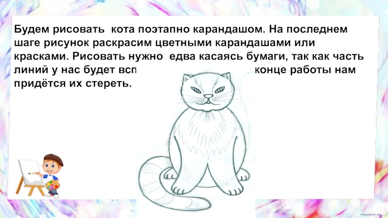 Слайд 34Будем рисовать кота поэтапно карандашом. На последнем шаге рисунок раскрасим цветными