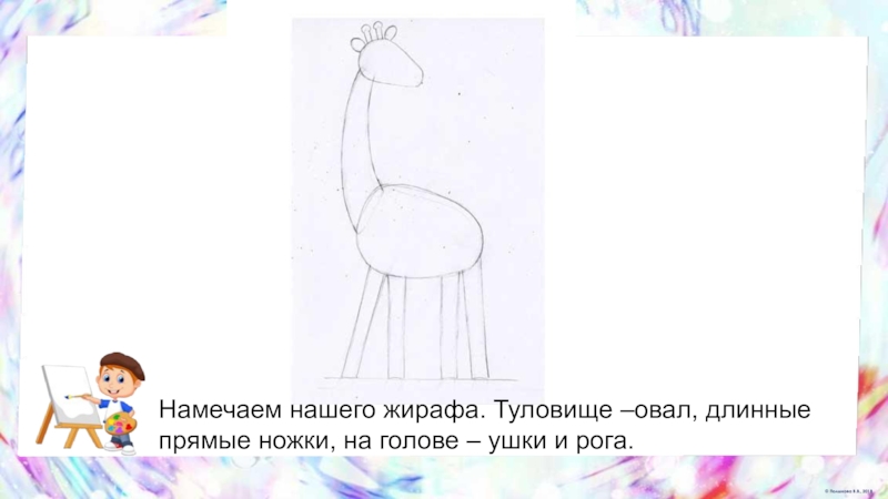 Слайд 25Намечаем нашего жирафа. Туловище –овал, длинные прямые ножки, на голове –