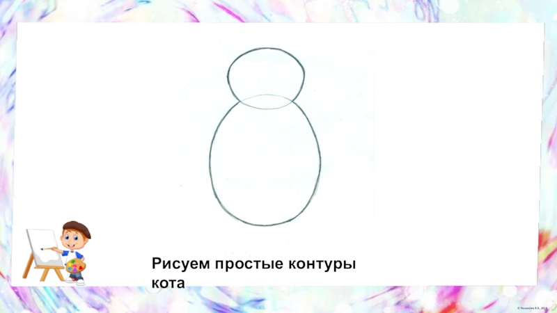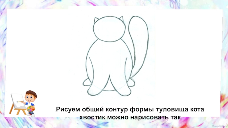 Слайд 36. Рисуем общий контур формы туловища кота
