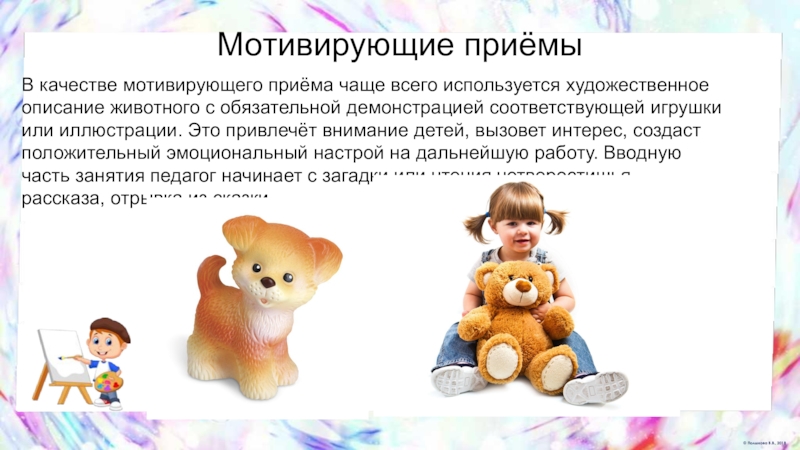 Слайд 6Воспитатель продумывает моменты, стимулирующие заинтересованность и творческую активность. Мотивирующими приёмами могут