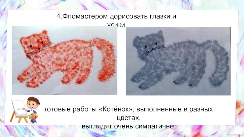 Тычкованием котёнку рисуют шёрстку