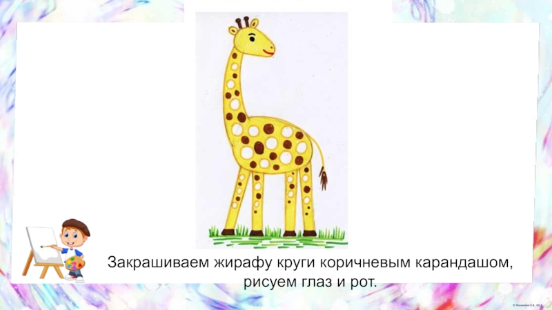 Слайд 28Закрашиваем жирафу круги коричневым карандашом, рисуем глаз и рот.