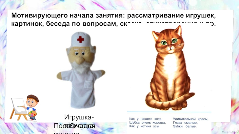 Слайд 32Мотивирующего начала занятия: рассматривание игрушек, картинок, беседа по вопросам, сказка, стихотворения