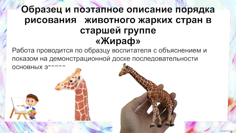 Слайд 24Образец и поэтапное описание порядка рисования животного жарких стран в