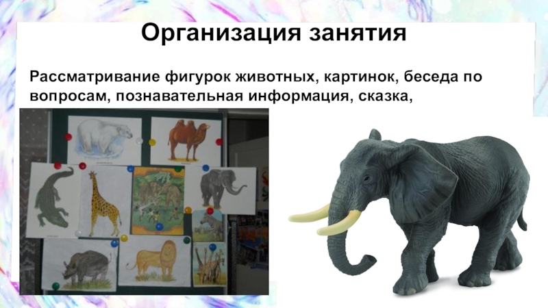 Рассматривание фигурок животных, картинок, беседа по вопросам, познавательная информация, сказка,